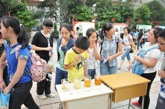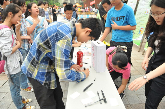 同样引起很多同学围观的还有演示烟草危害的实验现场。一条条活泼可爱的小金鱼,被分别放入清水,半支烟的烟草浸出液,一支烟的烟草浸出液和两支烟的烟草浸出液中。当清水中的小鱼还在悠闲的游动时,浸泡在最高浓度眼擦浸出液中的小鱼已经出现了严重的不良反应,身体变得难以保持平衡,10分钟以后,浸泡在一支烟的烟草浸出液中的小鱼也出现了不良反应。“才两支烟就这么厉害!”观看实验的同学说:“小鱼好可怜啊。”控烟卫士马上为他做出解释:“正是为了让更多的人亲眼看到烟草的危害有多大,我们才做这个实验,很多吸烟者一天都不只吸两根烟,想想他们的身体又受到了多大的伤害。小鱼确实做出了牺牲,但是我们希望它的付出能让更多人了解烟毒,拒绝香烟。如果要想挽救这两条泡在烟草浸出液中的小鱼,应该怎么办呢?”“放回清水里!放回清水!”大家都这样回答。果然,把小鱼放回清水以后,它们的身体又渐渐灵活了起来。