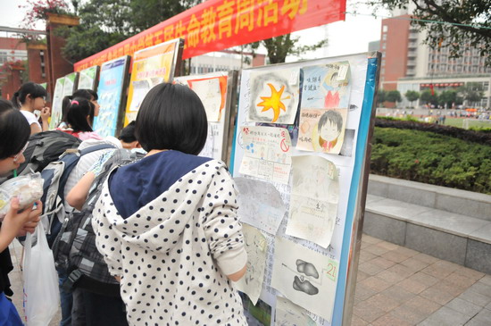 下午4点50,随着下课铃声的响起,我们的活动正式拉开序幕。一块块写满禁烟知识的展板,一幅幅由本校同学自行设计的禁烟宣传画,加上不断播放的公益短片,吸引了过往同学纷纷驻足观看。“啊,你看吸烟者的肺,好可怕!”一位看展板的同学对她的同伴说。守候在一旁的控烟卫士立刻为他们讲解以来:“对,吸烟者的肺会被各种有害物质所侵害,但是吸烟所损害的还不止是他们的肺……”精彩的讲解吸引来了更多的听众。