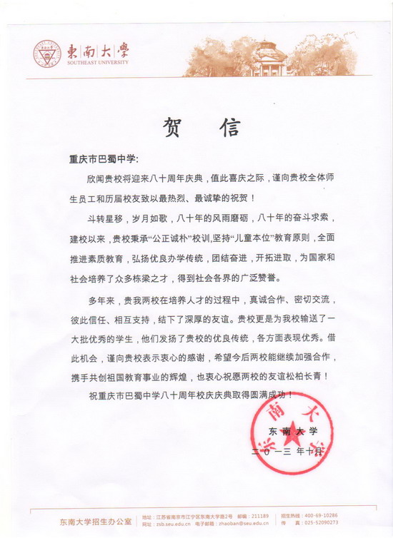 重庆市巴蜀中学校 办公室电话:023-63002371 招生咨询电话:023-63002629 学校地址:重庆市渝中区北区路51号 邮编:400013