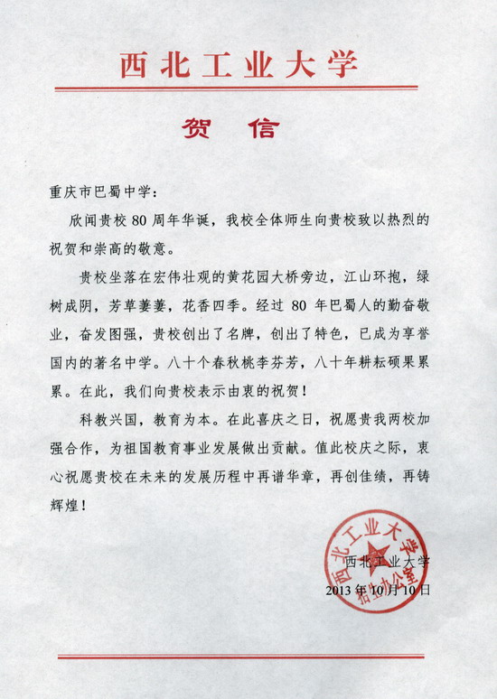 西北工业大学致巴蜀建校80周年贺信