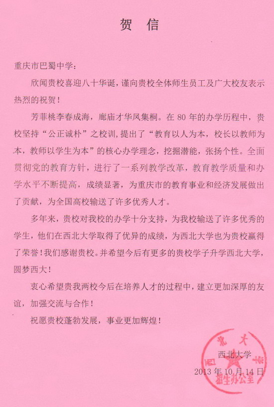 重庆市巴蜀中学校 办公室电话:023-63002371 招生咨询电话:023-63002629 学校地址:重庆市渝中区北区路51号 邮编:400013