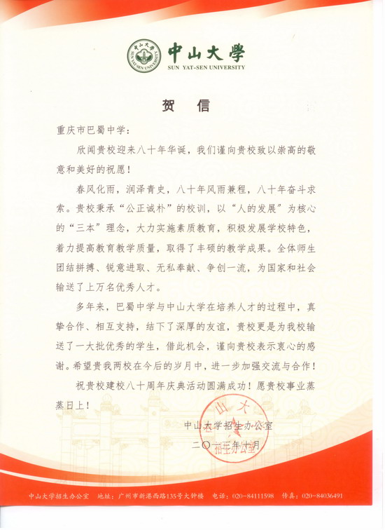 重庆市巴蜀中学校 办公室电话:023-63002371 招生咨询电话:023-63002629 学校地址:重庆市渝中区北区路51号 邮编:400013