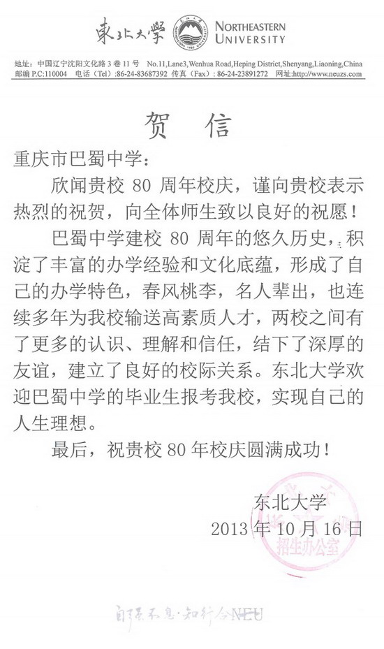 重庆市巴蜀中学校 办公室电话:023-63002371 招生咨询电话:023-63002629 学校地址:重庆市渝中区北区路51号 邮编:400013