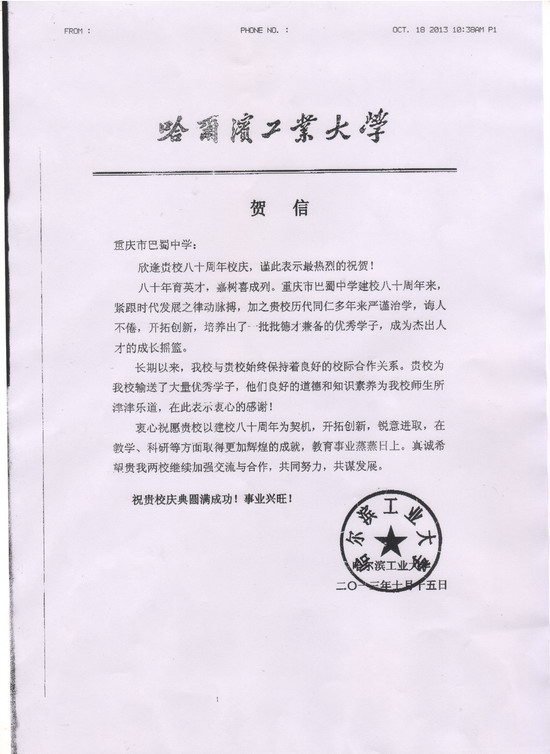 哈尔滨工业大学致巴蜀建校80周年贺信
