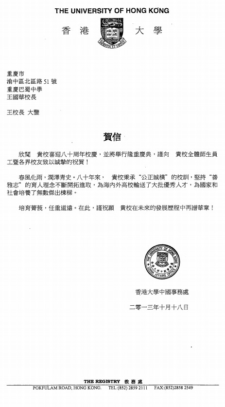 香港大学致巴蜀建校80周年贺信