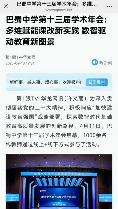 (巴蜀网 张成豪 郑亚平 冯茜)2025年4月11日,巴蜀中学第十三届学术年会启幕,一千余名一线教师通过线上、线下方式参与了活动。