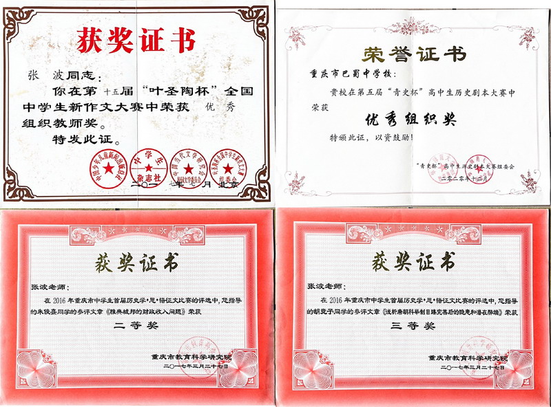先后获国家级教学成果奖二等奖、重庆市政府教学成果奖特等奖(2项)、重庆市政府教学成果奖一等奖等奖项;代表重庆参加全国高中历史课堂教学竞赛(现场赛课)获一等奖。