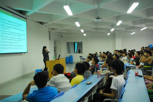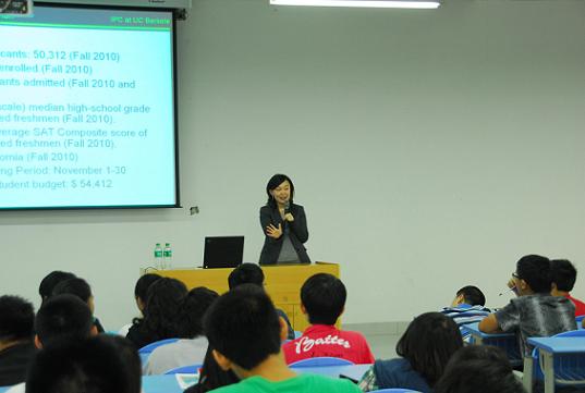 2011年9月14日,美国加州大学伯克利分校亚洲区招生官员Brenda、Victor一行前来巴蜀,向我校学生现场解答申请该校的相关事项,这是继南加州大学招生官员来访后,又一所直接到我校的美国顶尖名校。说明会上,我校学生认真听取了南加州大学伯克利分校的招生条件,注意事项,并积极向两位招生官员提问,场面热烈而有序。