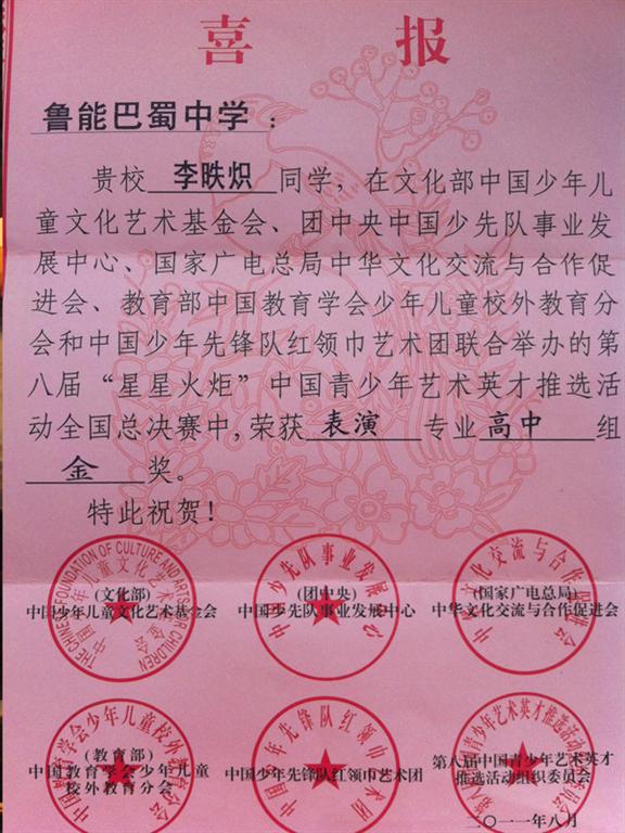 我校高二年级李昳炽同学在由文化部中国少年儿童文化艺术基金会、团中央中国少先队事业发展中心、教育部中国教育学会、中国少年先锋队红领巾艺术团联合举办的第八届“星星火炬”中国青少年艺术英才推选活动全国总决赛中,荣获表演专业高中组金奖。