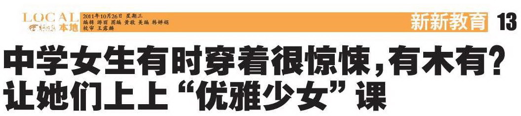 优雅少女课,由学校3名老师——王红英、邱艳、杨百灵任课,课程安排有礼仪,如打电话、用餐;服装搭配,化妆、护肤,发型设计。