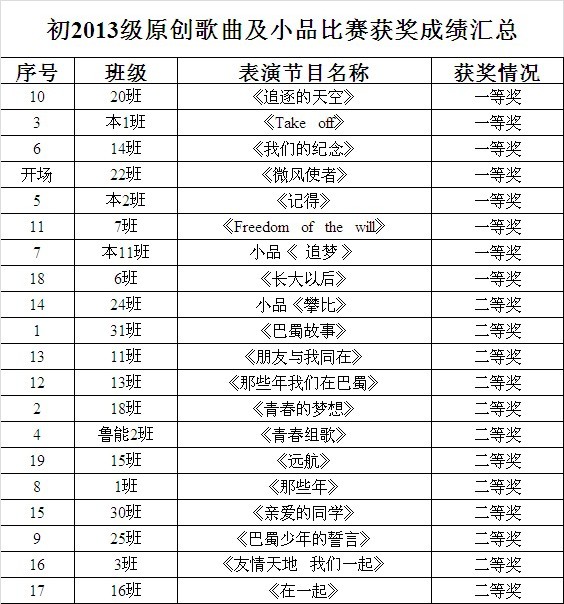 各个班级表现出了良好的艺术素养和较高的创作潜质,选手们也都赛出了水平、赛出了风格,充分展示了巴蜀少年全面发展、健康活泼、积极向上的精神风貌,也为2012年的校园生活增添了无穷的色彩,开启了艺术与青春齐飞的大门,相信这次活动会成为学子们青涩的成长岁月中一道亮丽的风景,一串闪光的记忆。