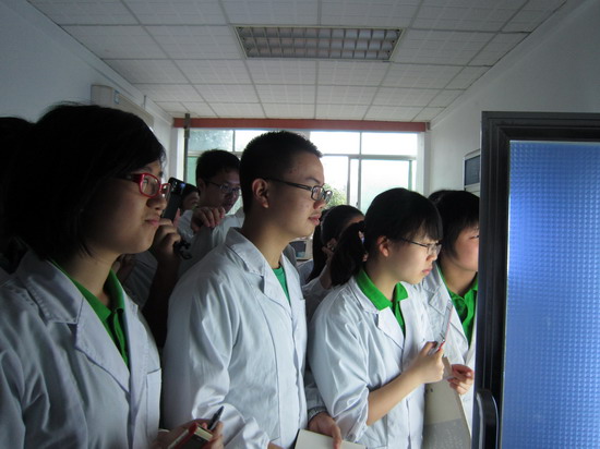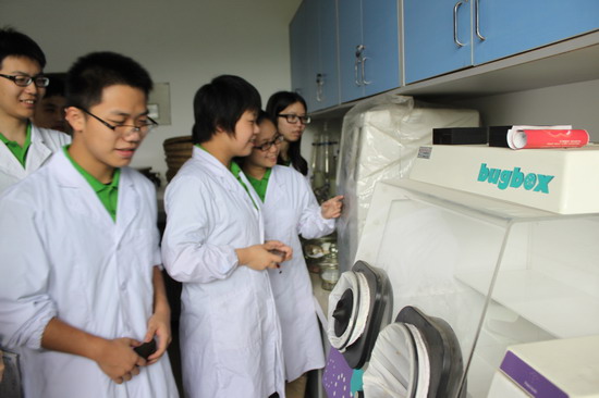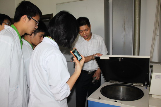 徐耀波老师热情的接待了同学们,还亲自为学生们讲解他们将用到的各种先进仪器的功能和具体使用方法。同学们感叹说:像离心机、恒温培养箱、无菌操作台等这些平时只听过没看过的仪器今天竟然可以使用这些仪器开展探究实验。乘着同学们火热的激情,季鑫、何鑫老师顺势引导学生在学习教材实验原理的基础上提出更深入的问题进行探究。同学们以实验小组的形式开展了具体实验探索,在老师们的鼓励和指导下纷纷提出自己的研究课题,探讨如果改变酵母菌的生长环境其种群数量将如何变化。实验就在热烈的气氛中进行了五个小时,同学们都已达到了废寝忘食的程度。实验的具体操作完成后,要得到实验结果还需让酵母菌生长七天,同学们带着留恋和期待离开了实验室,回到学校。