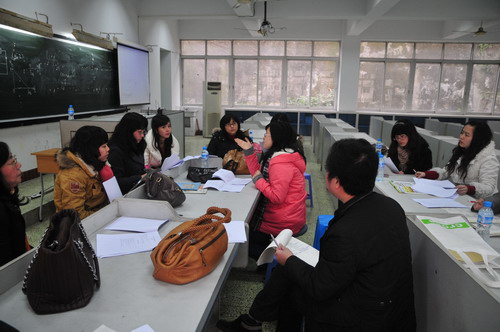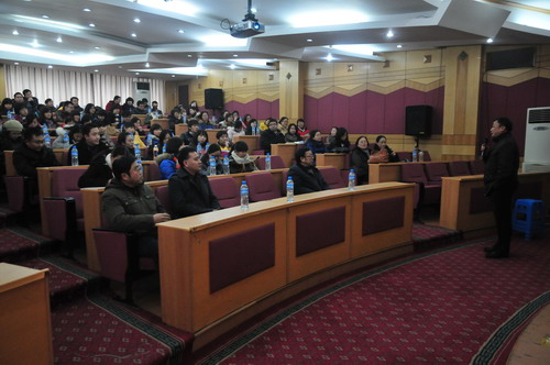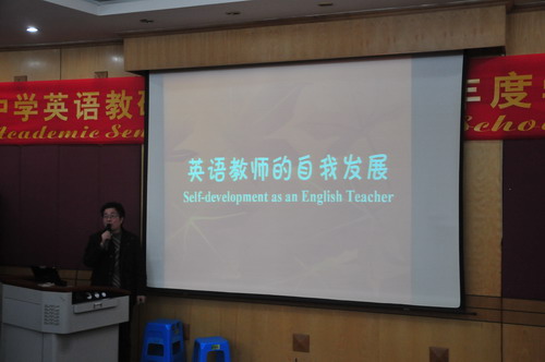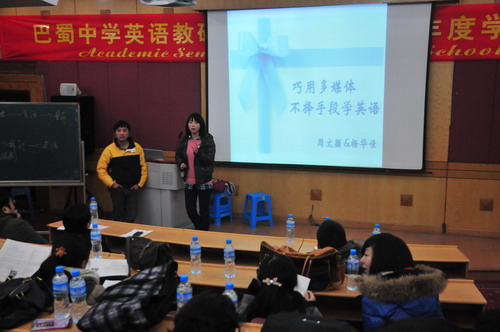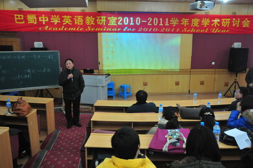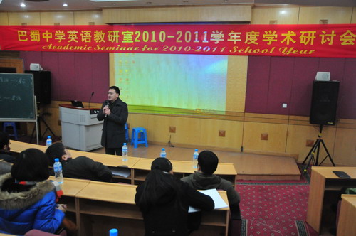 巴蜀中学英语教研室2010-2011学年度学术研讨会于2011年1月12日(星期三)下午2:30—5:30在学校逸夫科技楼学术报告厅举行,教研室全体教师参加了会议。学校党委张勇书记、教科处谭中胜主任到会指导并就科研及教师发展作了重要讲话。本次年会的主题是:锐意进取,自我发展。研讨会分两部分,第一部分全教研室大会,教研室主任张志建作了“英语教师的自我发展”的主题报告。张老师根据自己的研究并结合自己的教学实践谈了英语教师自我发展的意义、发展的内容及途径。有理论阐述、案例剖析、方法论证,给人以启迪。