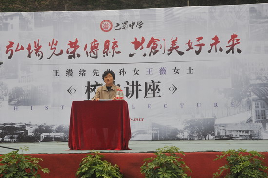 (巴蜀网 卢志强)为迎接我校八十周年校庆,在校庆倒计时200日之际,4月15日(星期一)上午,我们有幸请来了巴蜀学校创始人王缵绪先生的孙女王薇女士给巴蜀中学的老师和同学做了一次校史报告。