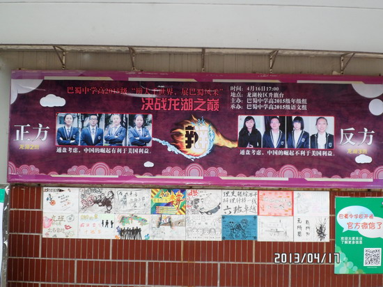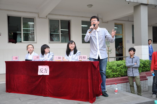 (通讯员 严吉林)4月16日下午五时,巴蜀中学高2015级“辩大千世界,展巴蜀风采”学生辩论赛龙湖校区决赛在升旗台如期举行,经过三轮鏖战,从16支队伍中脱颖而出来到决赛的分别是正方龙湖2班代表队和反方龙湖3班代表队。参赛双方就“通盘考虑,中国的崛起是否有利于美国利益”这一辩题展开了一场精彩的辩论。教科处主任谭中胜,高2015级教师张煜、周刘波、彭陈莲、严吉林担任本次比赛的评委。