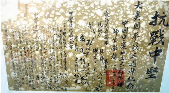 该祝辞卷轴作品分为祝辞、落款、签名三部分,长约50厘米,宽约40厘米。落款为“大美国参战三周年纪念。中国重庆私立巴蜀学校师生敬赠 1944.12.5”。