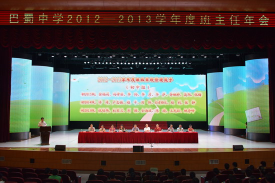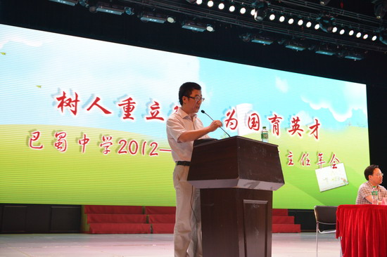 (高2014级 丁鑫)2013年7月4日下午,巴蜀中学2012—2013学年度班主任年会在鲁能巴蜀中学大礼堂隆重举行。学校党委书记副校长张勇、鲁能巴蜀中学校董事长原巴蜀中学校长傅唯泉、在校的其他校领导、各年级领导小组成员、全校班主任参加了大会。大会由学生处杜明元主任主持。