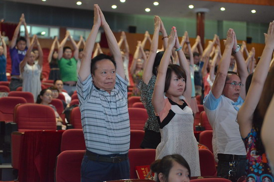 在大会进行过程中,心理教研室张澎老师带领两名初一的同学现场教全体与会老师做健心操,鼓励老师们在繁忙的工作中用健心操来放松身心。这体现了我校在重视提高班主任素养和业务水平的同时,也关爱着每一位老师的身心健康。