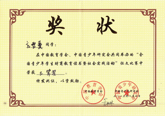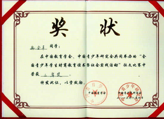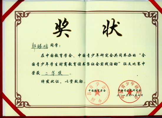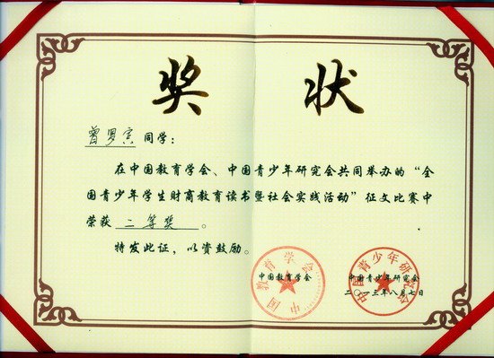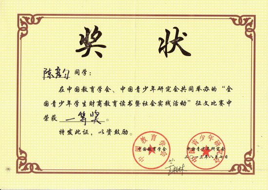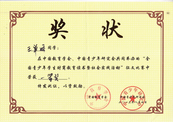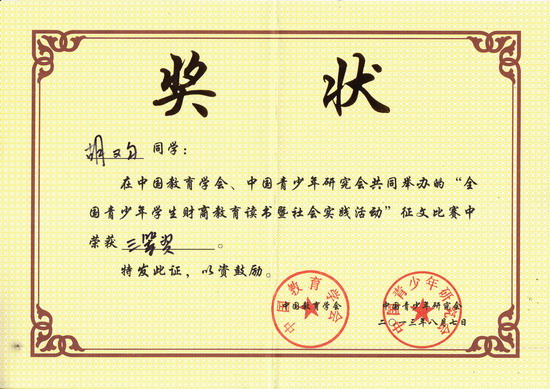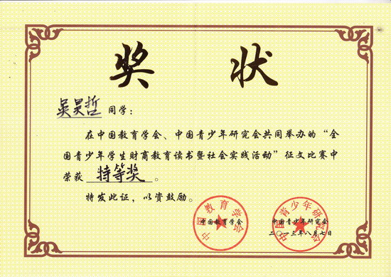 8月7日上午,首届全国青少年学生财商教育读书暨社会实践活动成果发表会在北京大学学术报告厅正式举行。来自全国各地的10名特优学生参加演讲比赛,我校吴昊哲同学凭借自己的实力,荣获全国唯一特等奖。在会专家对吴昊哲同学给予了很高的评价,认为他的演讲有广度、有深度、有力度、语言幽默、动作得体。随后,与会学生及老师参观了北京大学、金融博物馆、科技观。