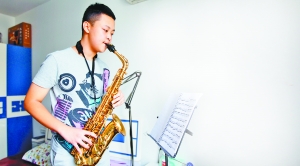 昨日,吴昊哲在家中吹起萨克斯,这个大男孩的爱好非常广泛。 重庆晨报记者 苑铁力 摄