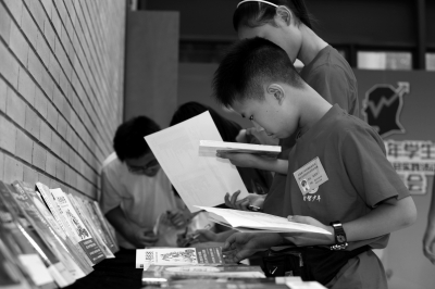在全国青少年学生财商教育读书暨社会实践活动成果发表会上,孩子们争先恐后地翻看财商方面的书籍。侯阳平 摄