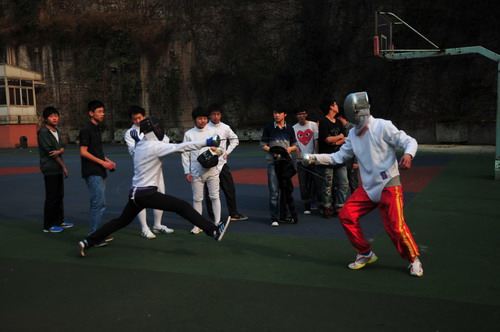 重庆凯撒国际击剑俱乐部乔琦教练(右一)义务指导学生《击剑》课程