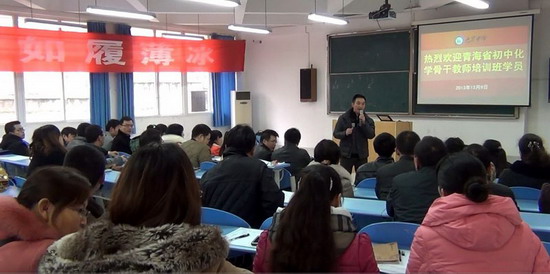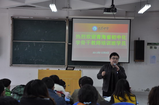 (巴蜀网 纪希)12月9日上午,由西南大学组织的“国培计划”青海省初中化学骨干教师培训活动在鲁能巴蜀中学进行,此次活动属于由教育部、财政部实施的中小学教师国家级培训计划(国培计划)的一部分。接到活动在我校进行的通知后,化学教研室主任田博文,组长马盈盈、代辉高度重视,精心策划了整个活动环节,将本次活动分为优秀教师献课,嘉宾点评,领导发言和观摩教研组备课四个环节,整个活动由田博文主持。