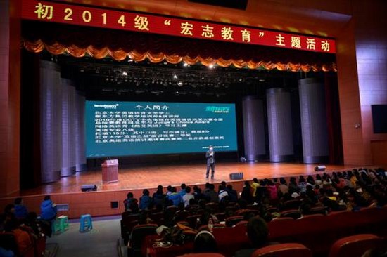 艾力老师毕业于北京大学,并获得2010年度CCTV中央电视台英语演讲风采大赛全国总结赛教师组亚军。他以幽默风趣的谈吐,深入浅出地解析了初三要做“重要的事情”,要树立明确的理想,以积极的心态面对困难等。55分钟的讲座内容深刻,令同学们受益匪浅,激起了“冲刺中考”的高昂斗志。