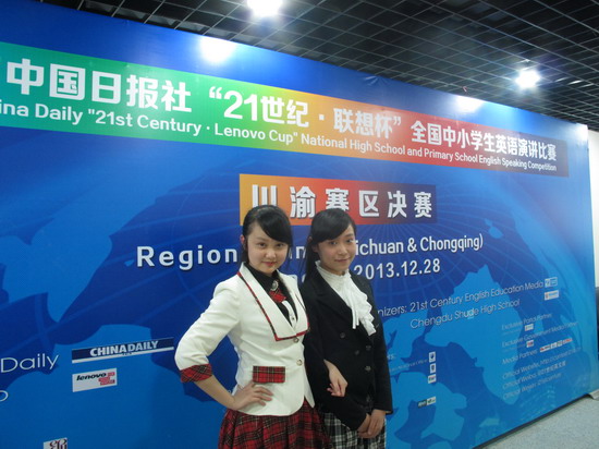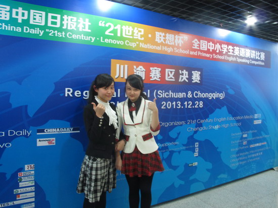 (巴蜀网 高2015级通讯员)巴蜀中学高2015级2班伍睿、黄子晋同学在成都树德外国语学校参加了由《中国日报》主办的“21世纪杯”全国中学生英语演讲比赛。在比赛中,他们准备充分,凭借自己的过人实力,出色发挥,荣获了川渝赛区一等奖,为我校争光。