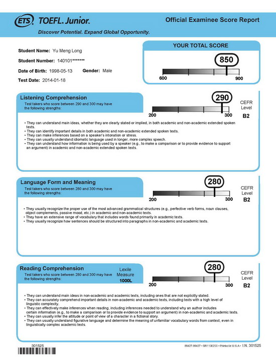 (巴蜀网 蒋昕)我校国际部的余孟隆于2014年1月18日参加了在重庆举行的TOEFL Junior考试,并取得了850分的高分!在本次考试中更有接近一半的学生获得了750分以上的优异成绩,在此向所有的同学表示热烈的祝贺!