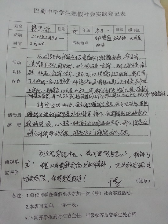 在寒假来临之际,初2016级同学们接到了年纪统一布置的寒假社会实践任务——独立赚取20元报酬。任务要求尽可能独立的发挥自己的能力和创意,凭自己个人的创意、努力、能力来换取20元的劳动报酬。让同学们感受独立生活的压力和挑战,锻炼理财能力、提高理财意识。同时进一步接触社会、了解社会;进一步的理解父母,感恩父母。