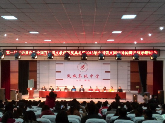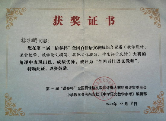 再次,2013年12月6日至8日,第一届“语参杯” 全国百佳语文教师颁奖典礼暨2013年全国语文同课异构课堂展示研讨会在山东莱芜凤城高级中学举行。陕西师范大学出版总社和《中学语文教学参考》编辑部承办了此次会议。来自全国各地的语文教师汇聚一堂,采取同课异构和专家互动点评的形式共同探讨了现阶段语文教学的方法和理念。我校语文教师、“活动式作文教学研究”工作室负责人杨宇鹏老师获得第一届“语参杯”“全国百佳语文教师”称号。工作室成员张伟参与了此次研讨会。