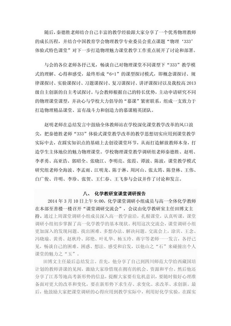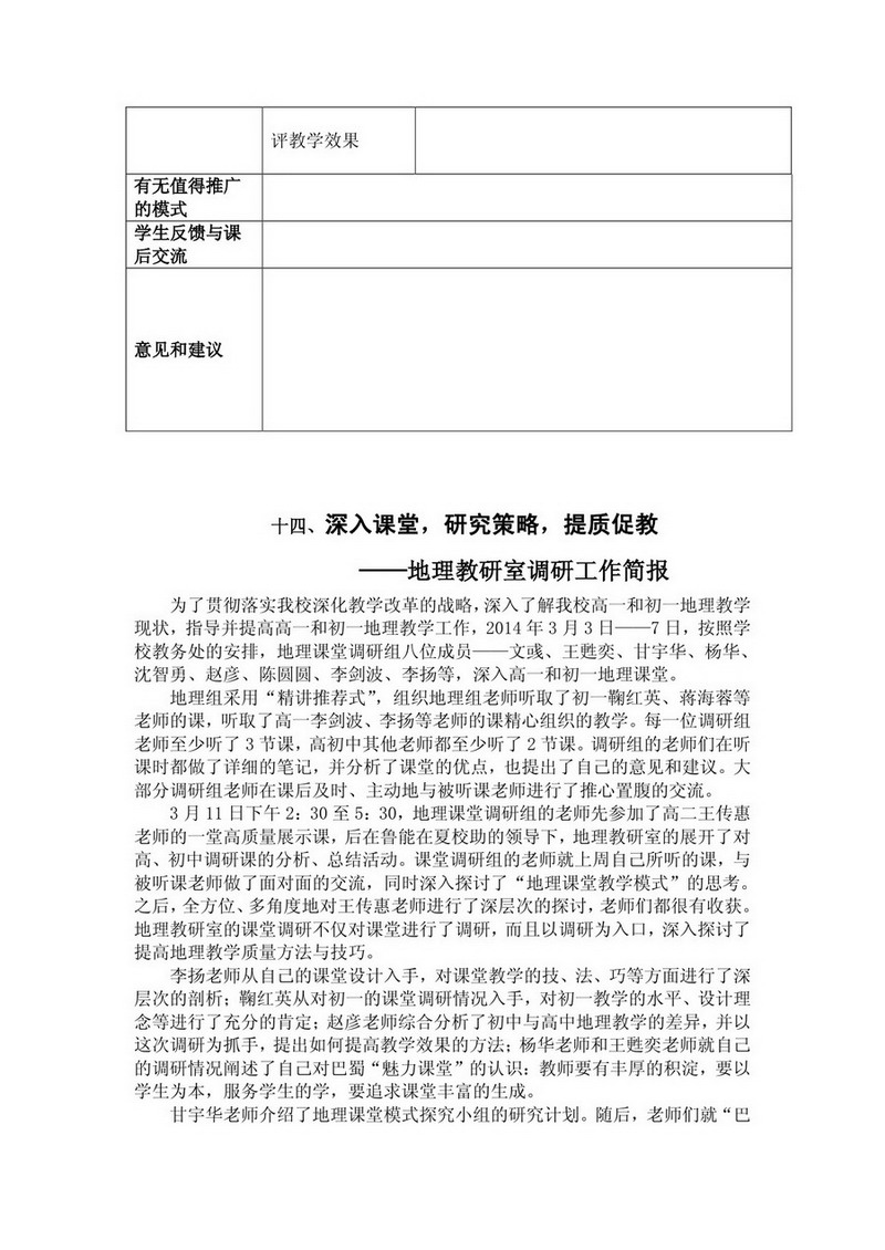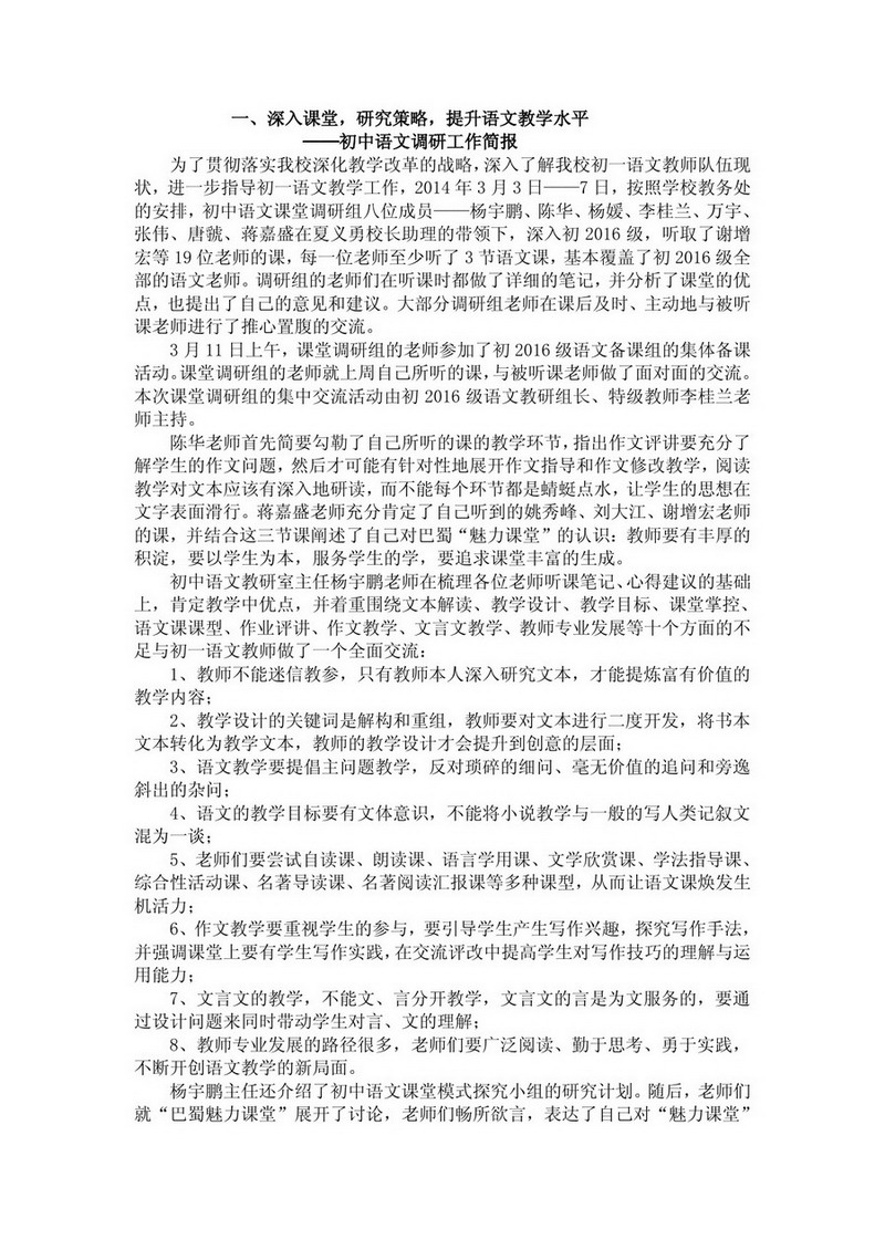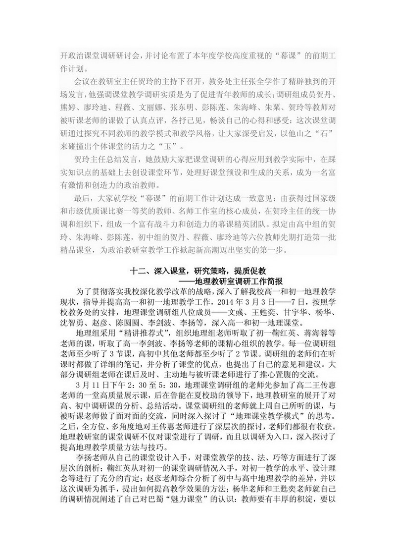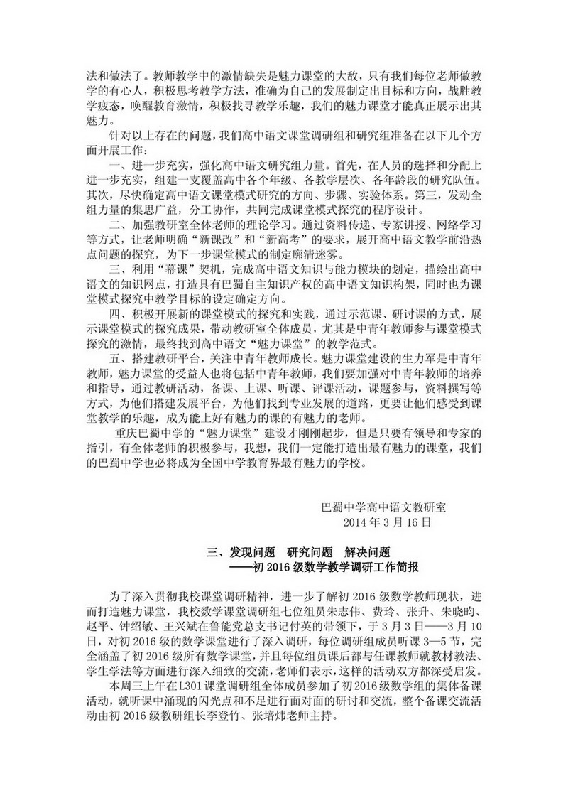 学校在第三周(2014年3月3—7日)由各位分管学科校长带队,教研室主任牵头,课堂调研小组分别进入高2016,初2016两个年级的课堂,坚持随堂听课。在第四周各教研室都进行了听课调研教师和年级学科教师的面对面交流。见面研讨会上大家表扬优秀的课堂,同时更多的是直面问题,并提出了切实可行的教学指导意见。老师们感觉这是一次接地气的真正的调研,是实战,是专家的会诊。大家都希望在学校的引领下,进一步钻研课堂教学艺术,打造巴蜀的“魅力课堂”,在巴蜀各学科的有效的,高品质的教学模式探究上迈出坚实的一步。