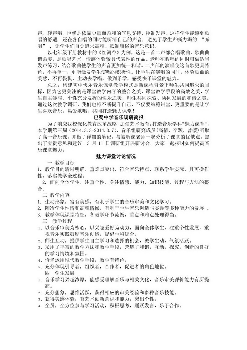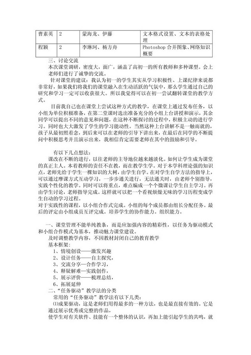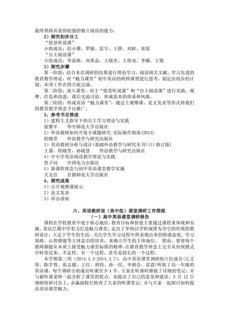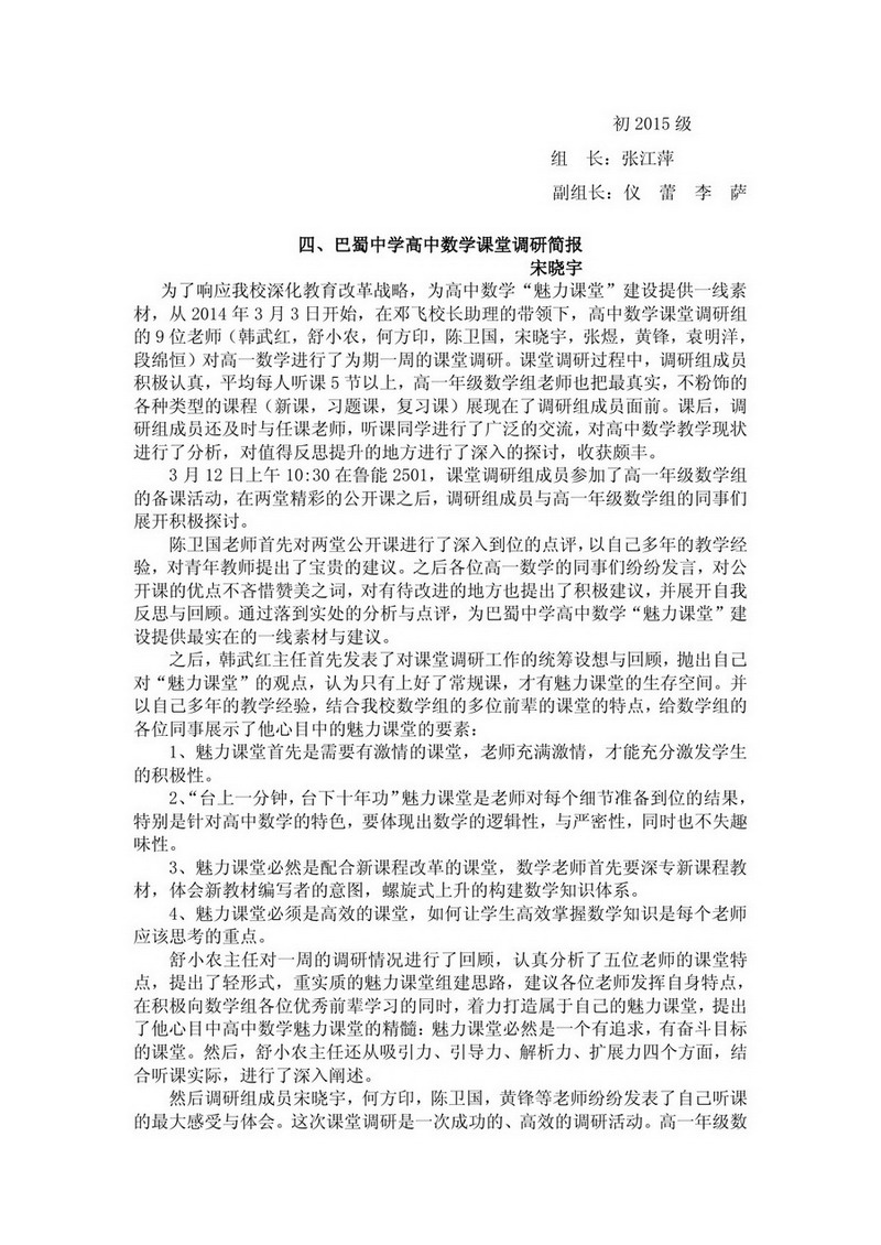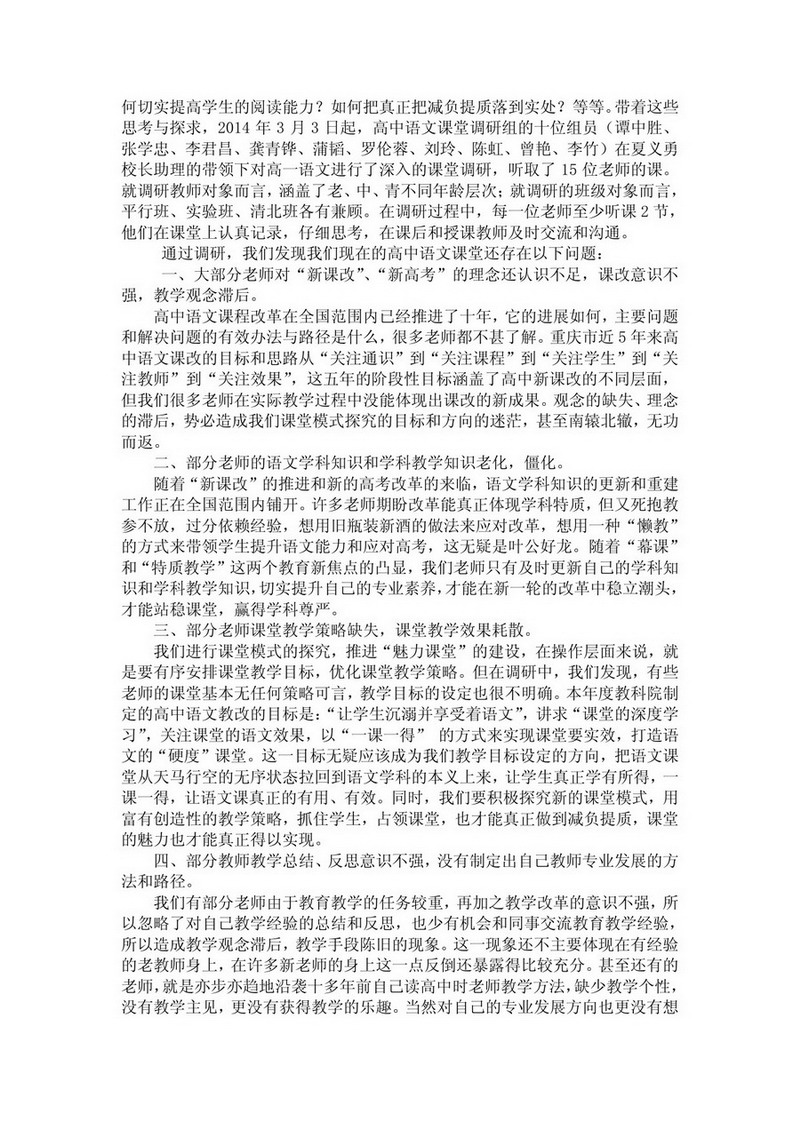 学校在第三周(2014年3月3—7日)由各位分管学科校长带队,教研室主任牵头,课堂调研小组分别进入高2016,初2016两个年级的课堂,坚持随堂听课。在第四周各教研室都进行了听课调研教师和年级学科教师的面对面交流。见面研讨会上大家表扬优秀的课堂,同时更多的是直面问题,并提出了切实可行的教学指导意见。老师们感觉这是一次接地气的真正的调研,是实战,是专家的会诊。大家都希望在学校的引领下,进一步钻研课堂教学艺术,打造巴蜀的“魅力课堂”,在巴蜀各学科的有效的,高品质的教学模式探究上迈出坚实的一步。