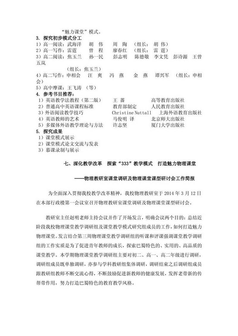 学校为了深化教学改革,成立了以王国华校长,张勇书记为组长,校长会其他各位成员为副组长的深化教学改革领导小组。具体工作由学校校长助理邓飞同志协调。与此同时还设立了课堂调研小组,教学模式探究小组,试题命制研究小组三个功能组。我们坚持精教博学的教学理念,把教学改革深入到课堂,深入到教师同行的探究,深入到同行专家的引领。