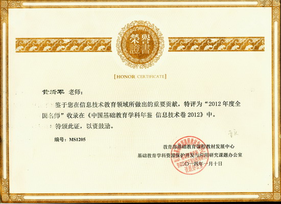 黄新军老师因为在信息技术教育领域中所做出的重要贡献,被教育部基础教育课程教材发展中心基础教育学科资源开发与应用研究课题办公室评选为全国名师,特此祝贺!