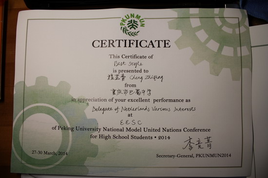 (巴蜀网 雷廷)3月27日-30日,2014年北京大学中学生模拟联合国大会在北京大学英杰对外交流中心隆重召开。参会人员包括全国89所高中的470余名学生代表,80余位观察员、志愿者以及近百名模拟联合国指导教师。在雷廷老师的带领下,我校的模拟联合国社团副秘书长程芷青、组织部部长王一荻、学术部部长彭彦植、国际部的杨城睿同学作为代表参加了此次大会。我校的刘胤含、池程参加了大会的志愿者工作;我校的李雨倩是本次大会的观察员。经过4天的紧张会议,巴蜀模联团队载誉归来。