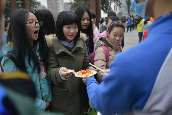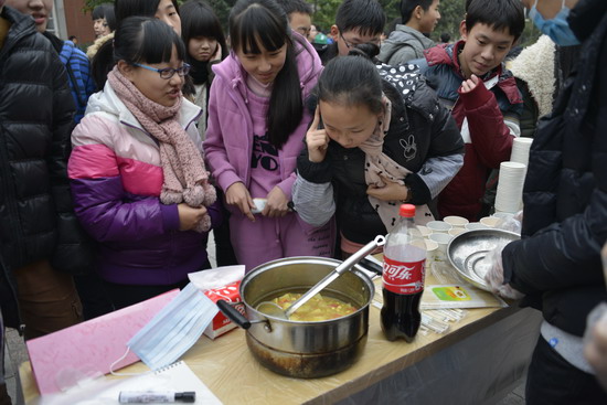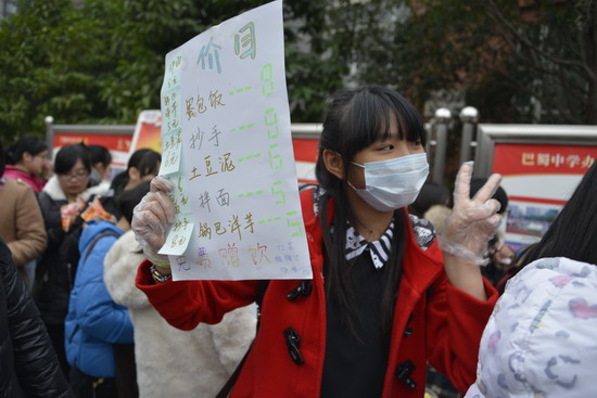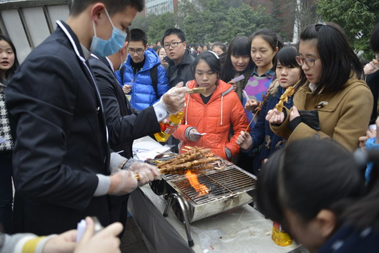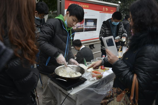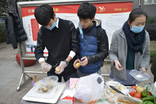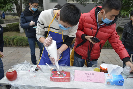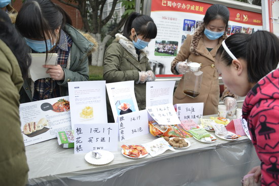 (巴蜀网 汪施佳)为了提升学生生活生存能力,提升学生的财商水平,2013年12月24日下午,由巴蜀中学社团联合会和味蕾社联合主办的首届校园美食节圆满举行。师生们在二十余个展台上亲手制作美食,各色菜式应有尽有。不仅让广大师生品尝到了干净卫生的自制美味,更提供了一个别样的平台供大家交流学习,锻炼动手能力。
