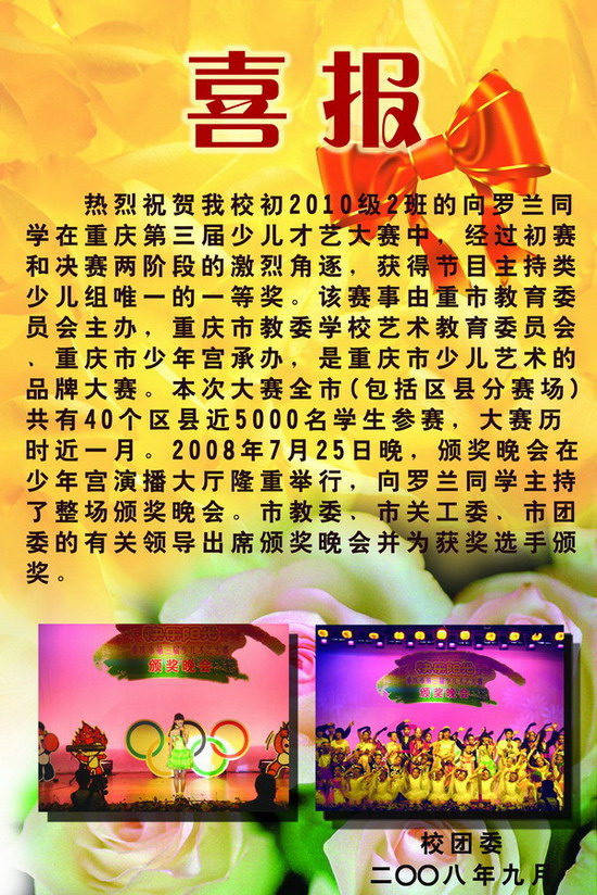 向罗兰同学在重庆市第三届少儿才艺大赛中获得一等奖