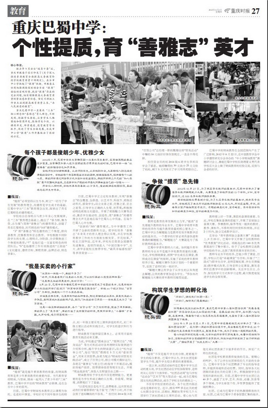“提质”就是提升素质教育的质量,而财商教育则是青少年素质教育的重要内容。当代教育家将财商,与智商、情商一起列入了青少年的“三商”教育。巴蜀中学开设的“财商教育”必修课,走在全市中小学的前列。