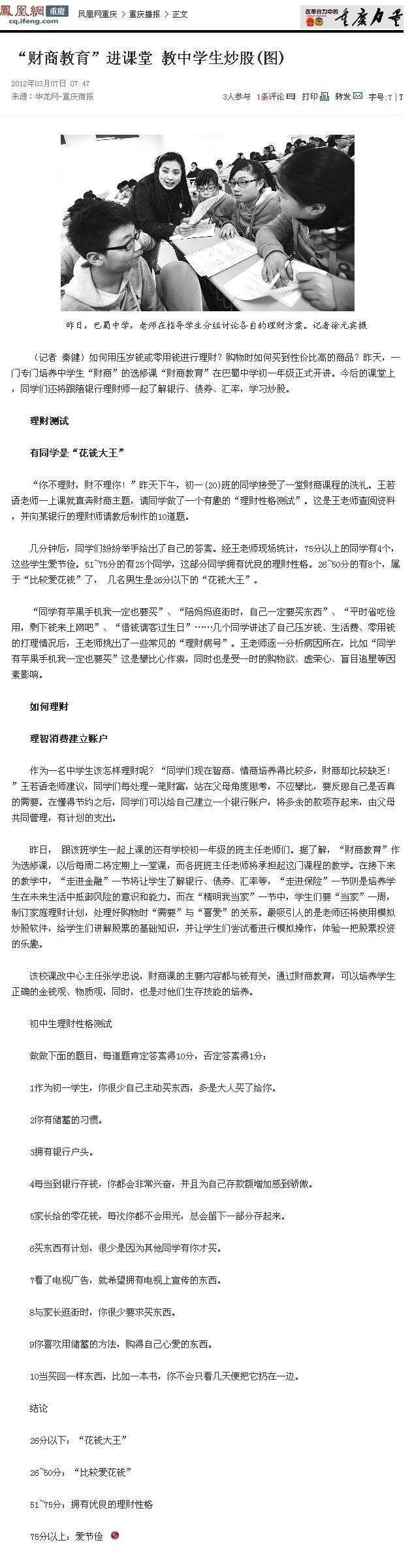 凤凰网:“财商教育”进课堂 教中学生炒股