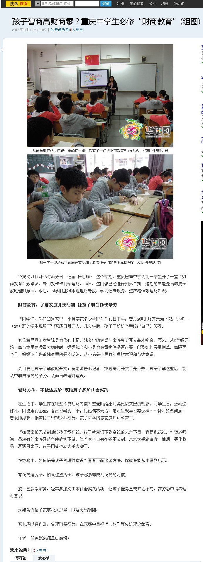 搜狐网:孩子智商高财商零?重庆中学生必修“财商教育”
