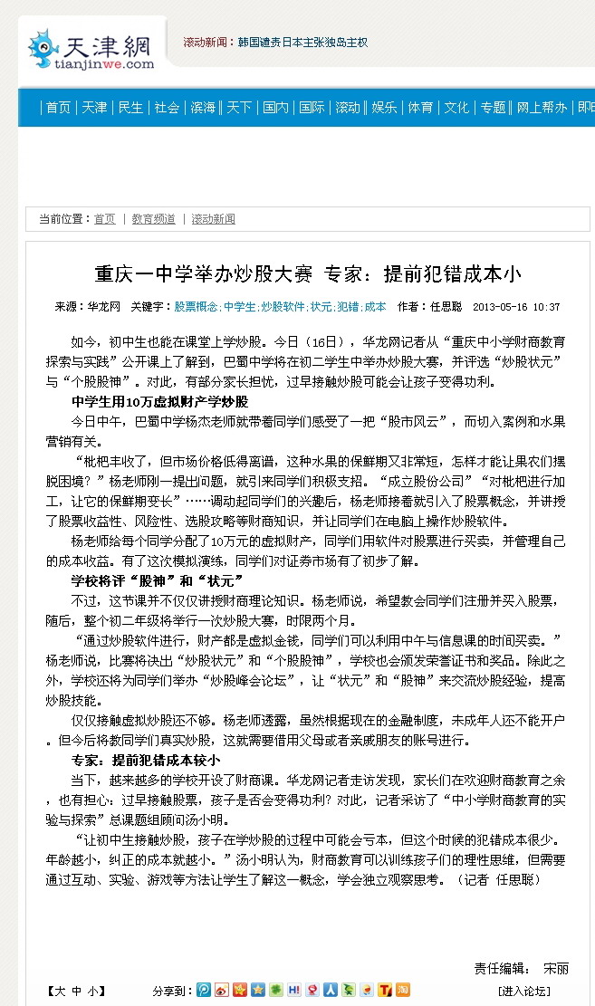 天津网:重庆一中学举办炒股大赛 专家:提前犯错成本小