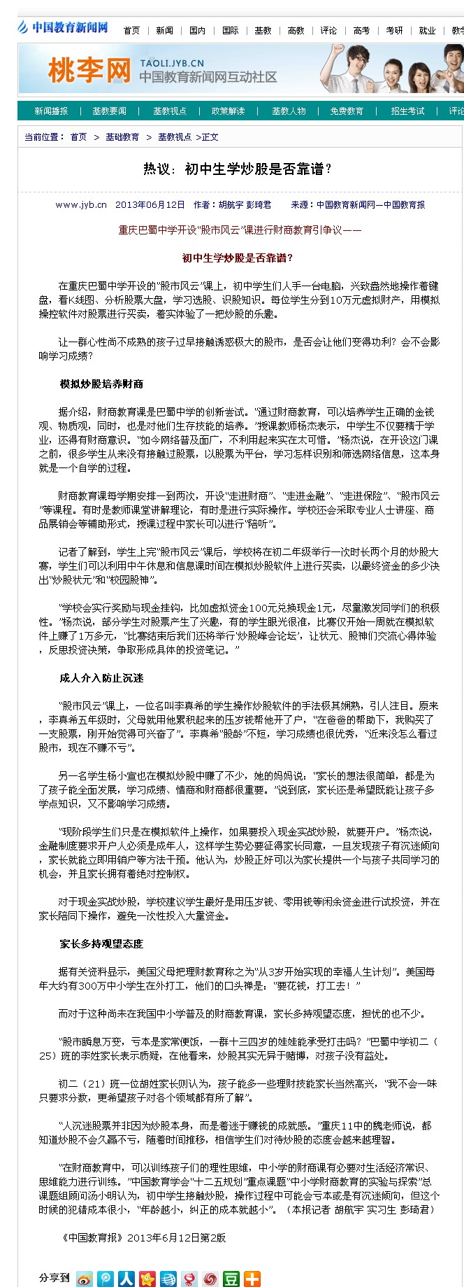 中国教育新闻网:热议:初中生学炒股是否靠谱?
