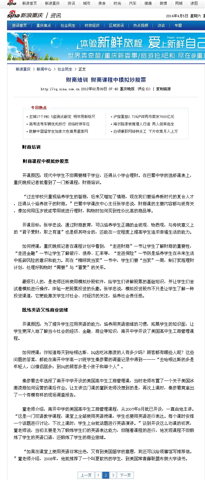 中国日报网:中学纷纷开设选修课 财商课上模拟炒股票