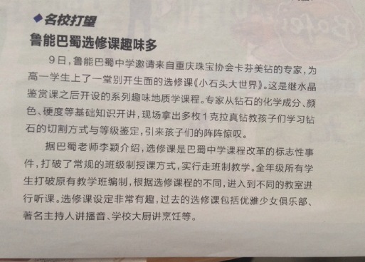 《新女报》:鲁能巴蜀中学选修课趣味多