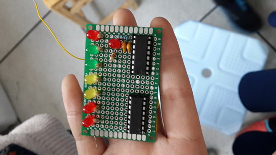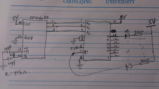各个小组的活动也十分丰富,建筑声学小组在教授带领下画起了建筑平面图,水污染研究小组在实验室亲生体验对水质的检测与分析广电传感小组在学长指导下学习了电路的测画与焊接….(图为广电传感组的流水灯电路图以及学生的成品)