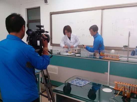 接下来在摄影记者的指导下进入实验录像阶段,由刚刚获得重庆市高中化学赛课一等奖的刘光影老师演示刚刚改进成功的实验。在仓促的时间,有限的信息,陌生的设备,要揭秘这个骗局还是一个非常有挑战的,经过大家的努力,用化学知识解决了一些实际问题,揭穿了一些骗局,这就是化学的魅力。