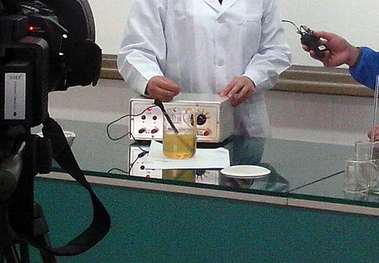 最近,中央电视台报道了一侧重庆大渡口区莫大爷买了一个健康洗脚仪被骗的新闻,在市场上引起很大的轰动,在学术界引起很多的讨论。4月21日,《重庆晚报》就此事深入调入,并相关化学问题采访了巴蜀中学化学教研室朱华英老师。为了更加深入、彻底的揭穿这个骗局,中央电视台牟亮记者一行慕名走进巴蜀中学化学教研室。