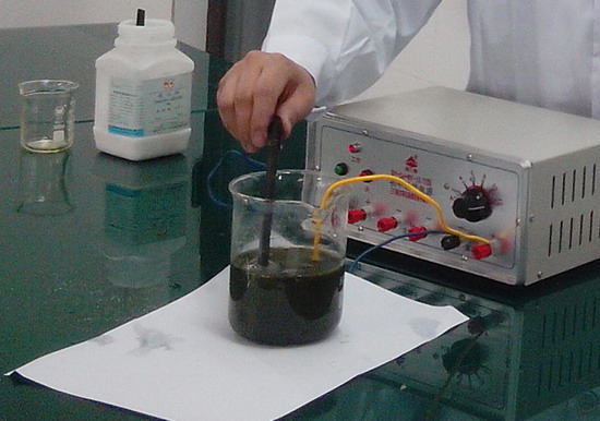 牟记者向田博文和刘光影播放了最近有关央视报道的这个视频,随后,在本部化学实验室两位实验员的配合下,田博文和刘光影两人都全力投入到验证实验、摸索实验。因为不知道这个健康洗脚仪中放的是什么东西。初步分析是合金为主,两位老师把负极确定为碳棒,正极分别尝试了铁钉、铜片、锌片、锈铁钉、锈铁丝、铝片等,甚至把实验室生锈的试管刷都损耗了10多个,改变电流大小、电压大小,都没有在预定的时间内出现这款健康洗脚仪出现的相同现象,大家都很着急。